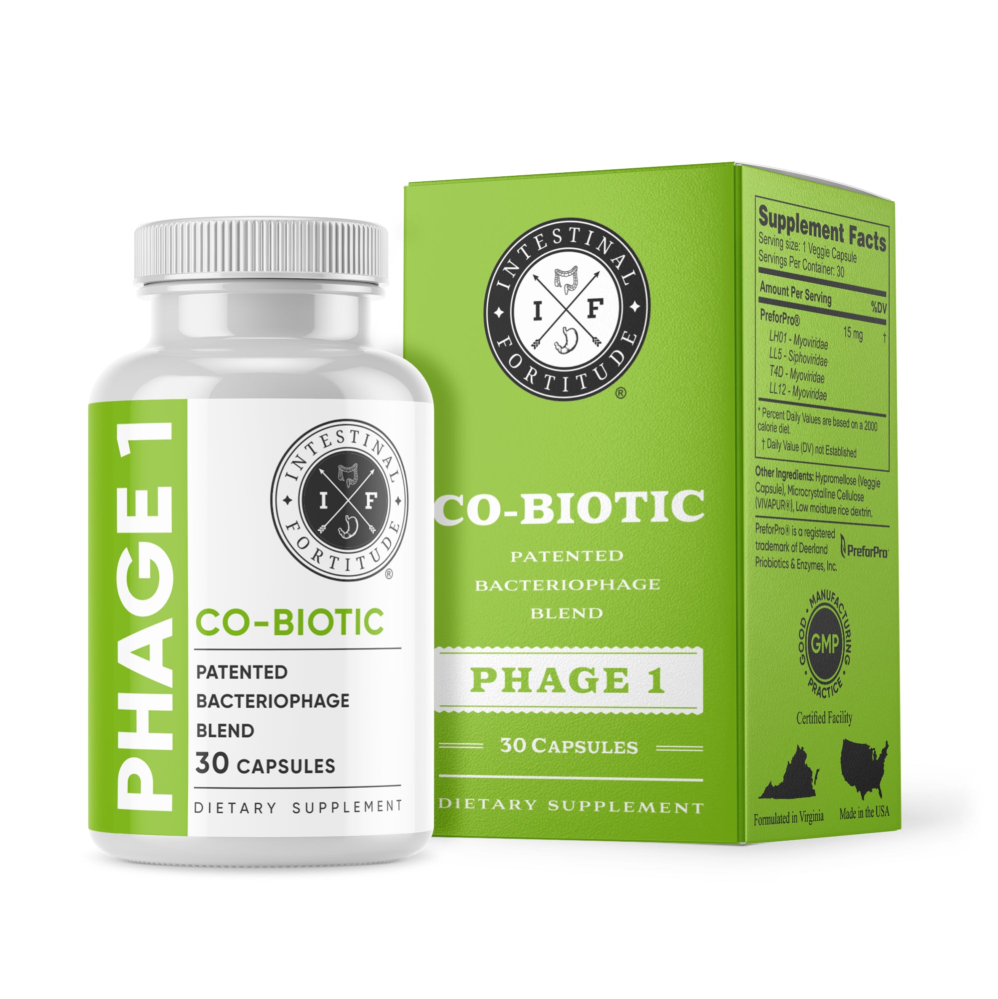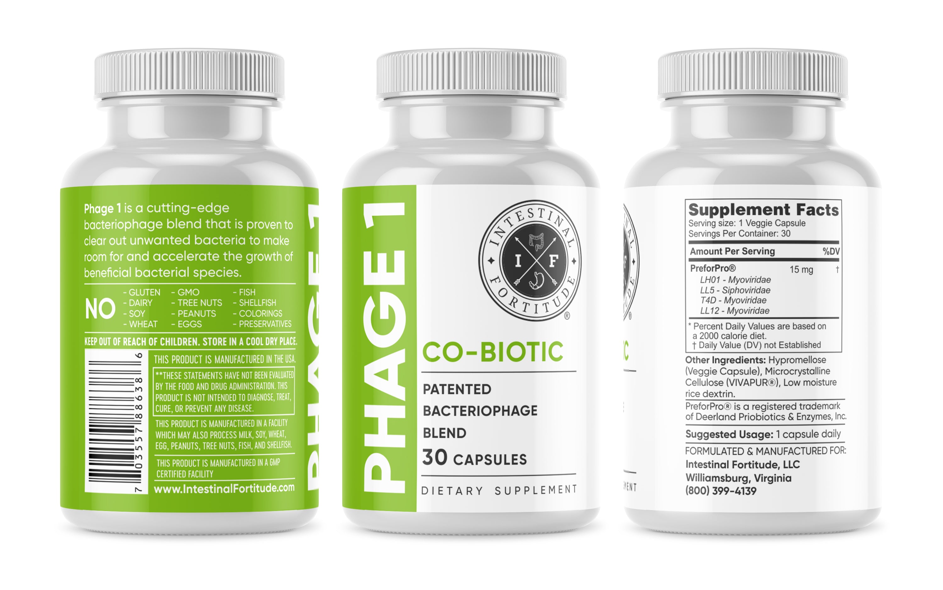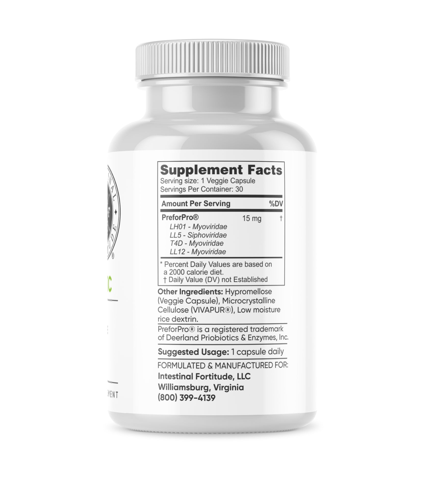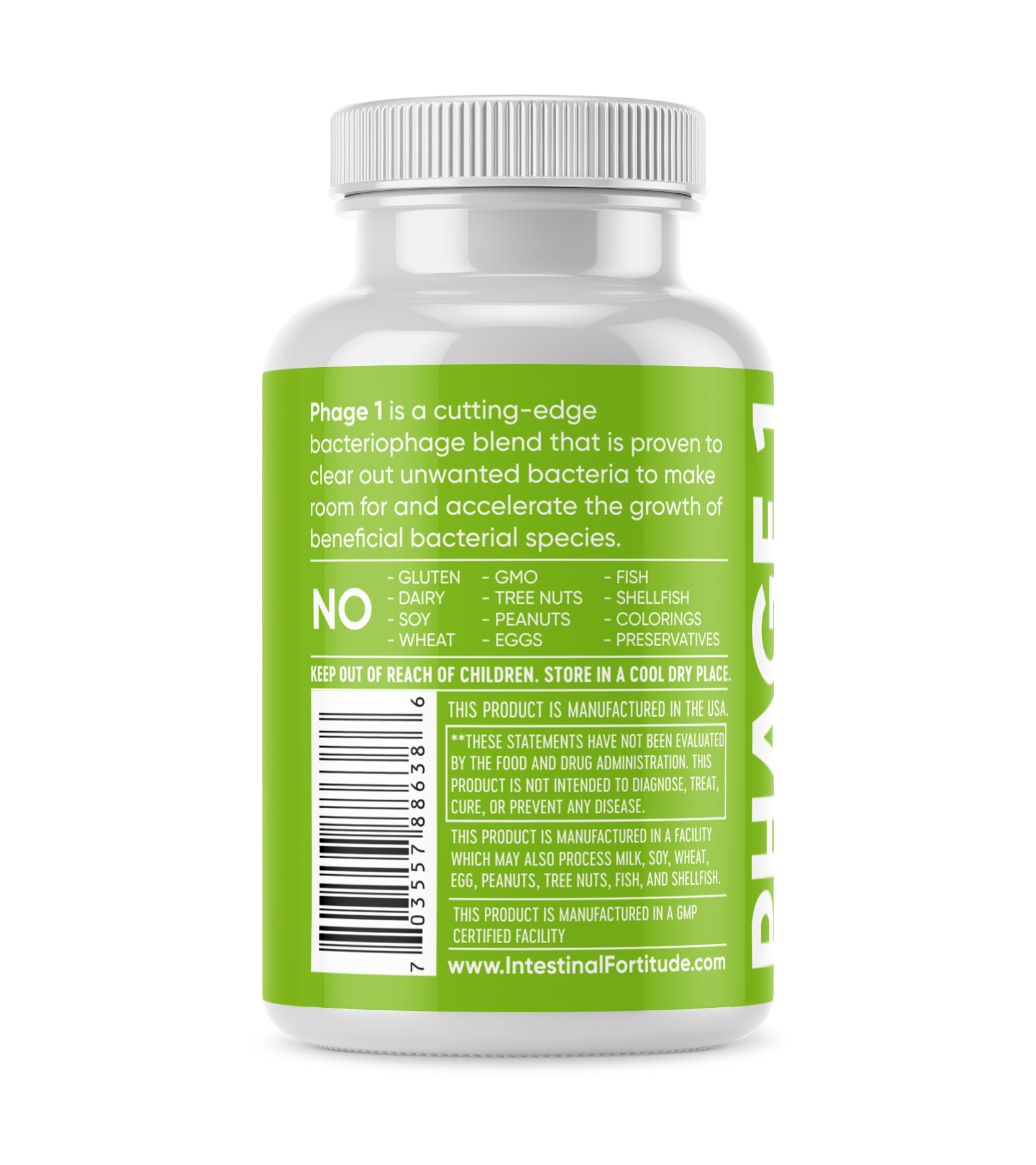 Similar to our PREbiotic Gold prebiotic supplement (link), Phage-1 works in both the small and large intestines. Because it is not a traditional starch or fiber based supplement it will not cause the gas and bloat that can be associated with other pre and probiotic supplements. Uniquely, Phage-1 starts to work within hours of your first capsule. No large doses, or loading phases.